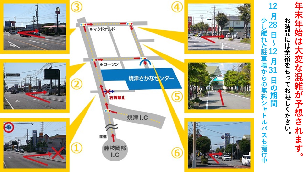 東名高速焼津ICより2分、新東名高速藤枝岡部ICより10分の焼津さかなセンター。ご来場のお客様の多数が高速道路を利用して来られますが、東名を右折してすぐの、さかなセンター手前の交差点(セブンイレブン目印)は右折禁止となっております。