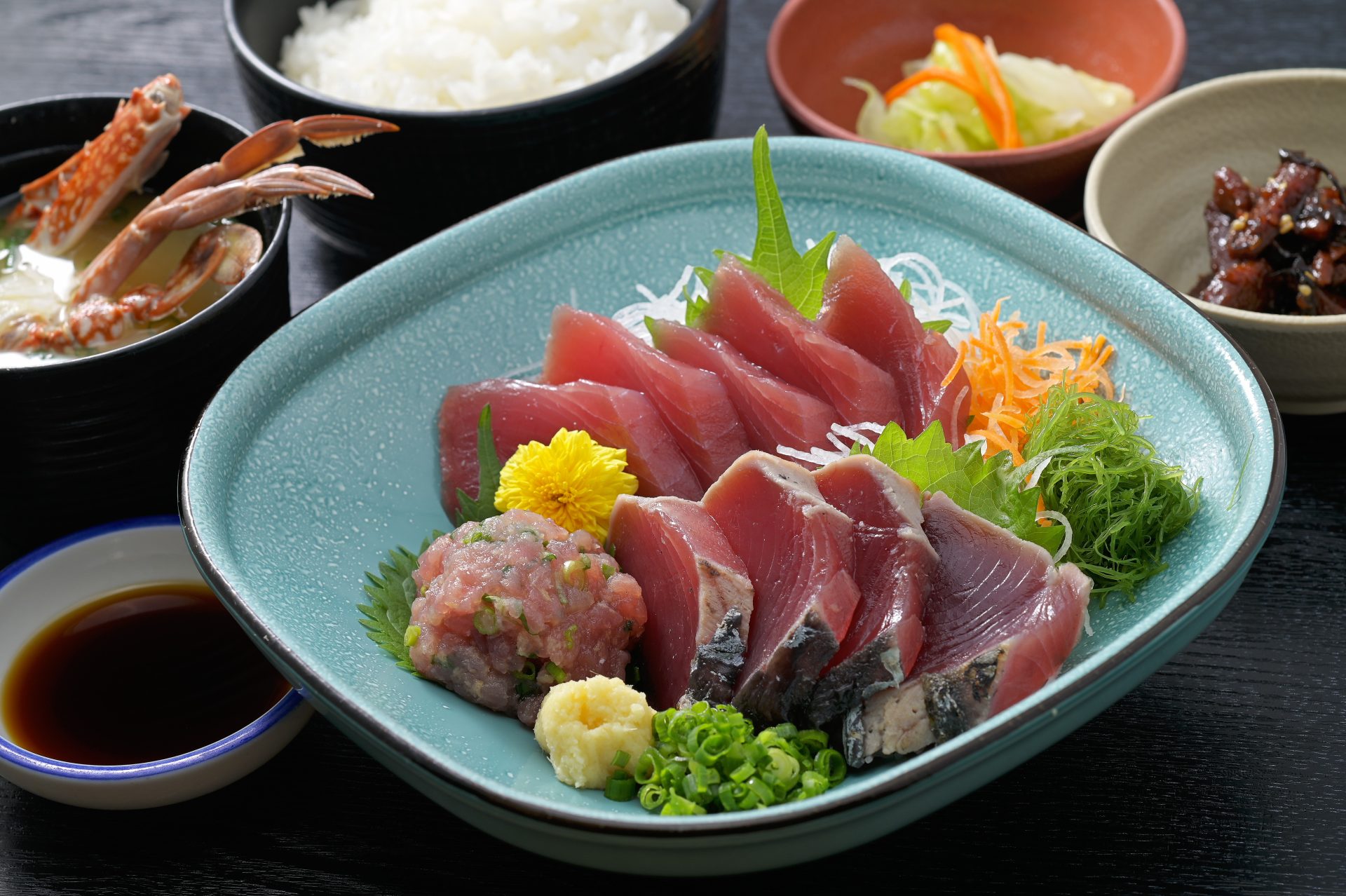 船のうえで血抜き処理まで施したブランドかつお「船上活き締めかつお」と 一本釣りのかつおで作った「たたき」、さらに自家製かつおの「なめろう」を盛り込んだ”かつお”尽くしの定食です